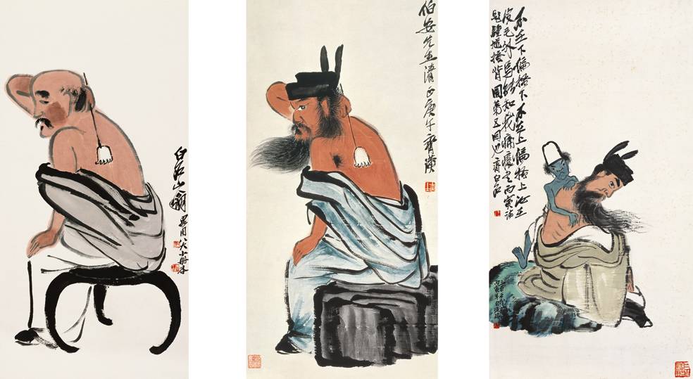 一个老头在挠痒痒,叫《搔背图》。第一张是齐白石学习八大山人的;第二张他自己改了,把老头变成了钟馗;第三张一个小鬼给钟馗挠痒痒。很有趣吗?这还不是终点。他的学生李可染,把这一张画又变成了一个小孩给老者搔背。