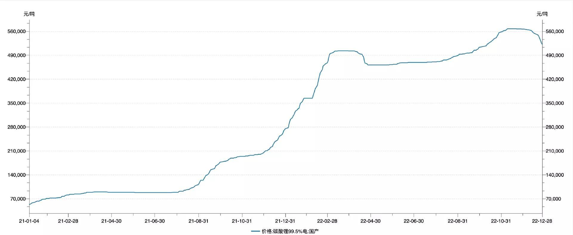 2021年,碳酸锂涨价幅度高达430%以上。进入2022年,局面进一步失控,碳酸锂价格从年初的28万/吨最高涨至超50万/元吨,在短短三个月的时间里又翻了近乎一倍。
