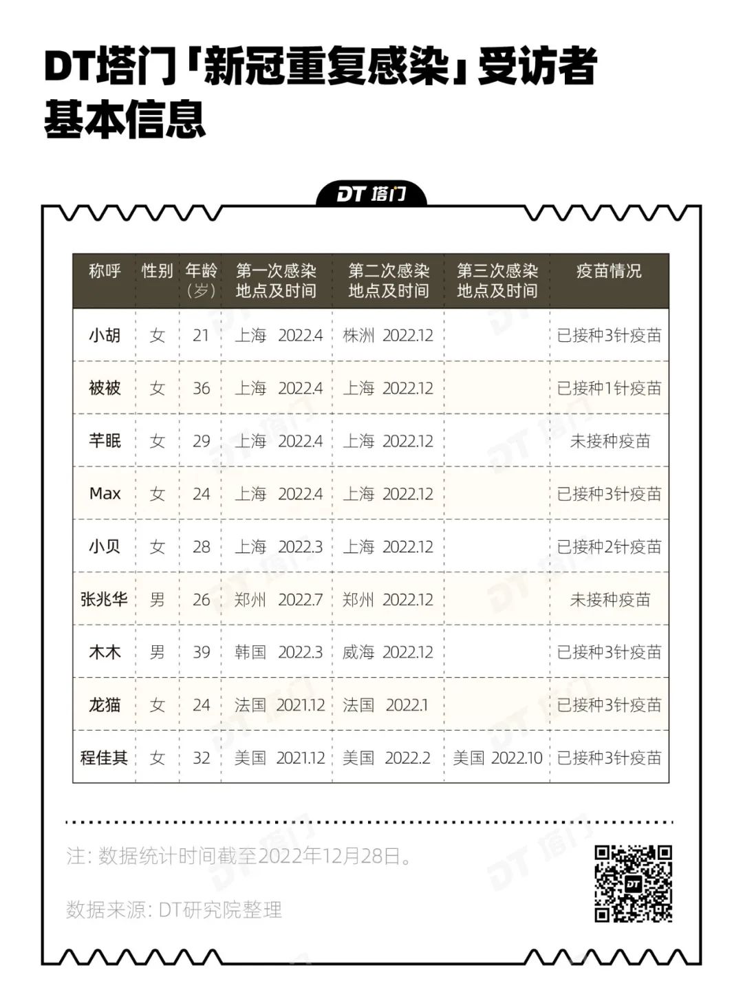 不过,群体不能代表个体,个体不能代表群体。为了了解重复感染新冠后的真实情况具体是什么样的,塔门采访了9位重复感染新冠病毒的患者,希望从感染症状、重复感染相隔时间、应对和预防措施等方面给大家提供一些参考。