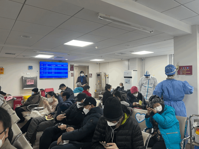 12月27日下午一点,北京三甲朝阳医院的发热门诊内,挂号、排队、睡觉的患者占满大厅内的铁皮座,通行的过道两侧已被患者加的床位塞满。