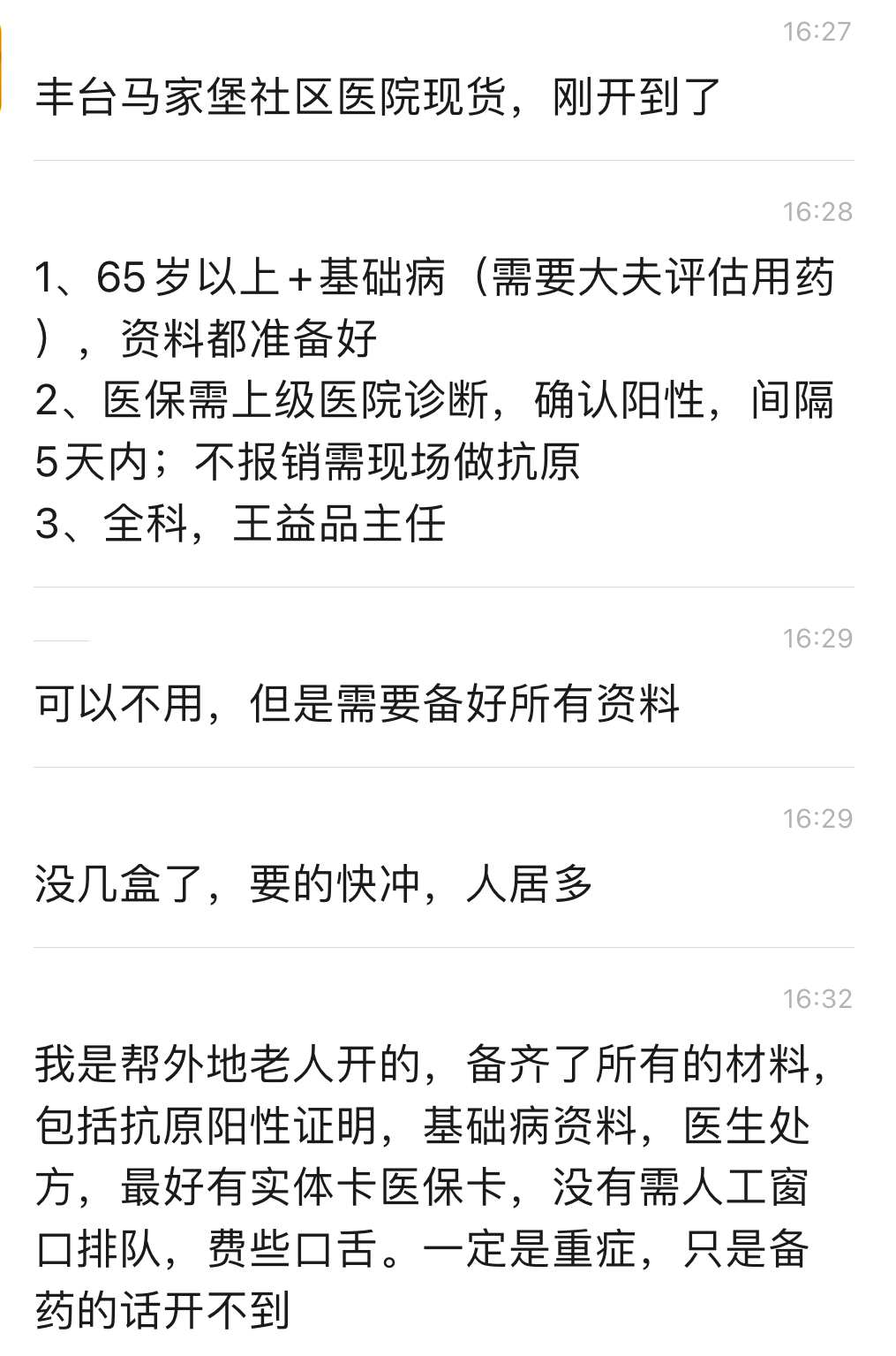 家住丰台的王晓就在社交平台发布消息说,“丰台马家堡社区医院有现货,刚到没多久,想要的快冲,也没剩几盒了。不一定要患者到场,但要准备好所有资料,最好有实体卡医保卡。”