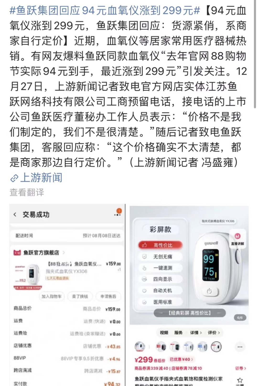 “原本不超过80元的鱼跃,现在在淘宝卖到了339元,京东是299元,但需要每天十点限量抢购,还是预售十五天,甚至疫情严重的地方,快递不一定及时送到。”Miya无奈说道。