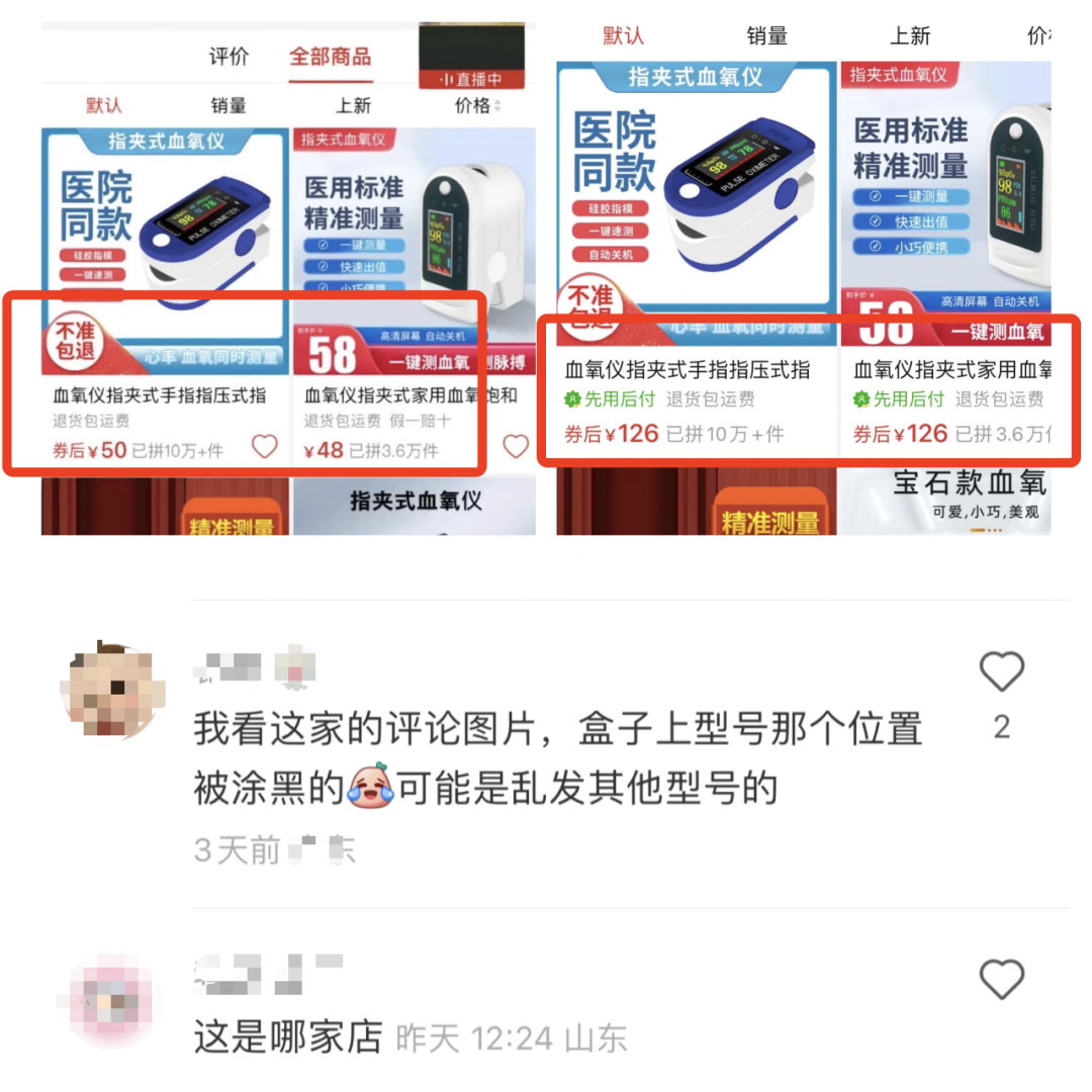 Miya被安利后,到拼多多、淘宝等电商平台搜时,看到店铺图片大红字写着“绝不涨价”,再看商品评价,清一色的3000+好评内容,她开始怀疑自己前面经历的一切都是营销手段,甚至上午收藏尚未购买的58元血氧仪,下午就翻倍售卖,再刷小红书时,就看有网友发帖反馈同款店铺:“被骗了,买回来货不对板”。