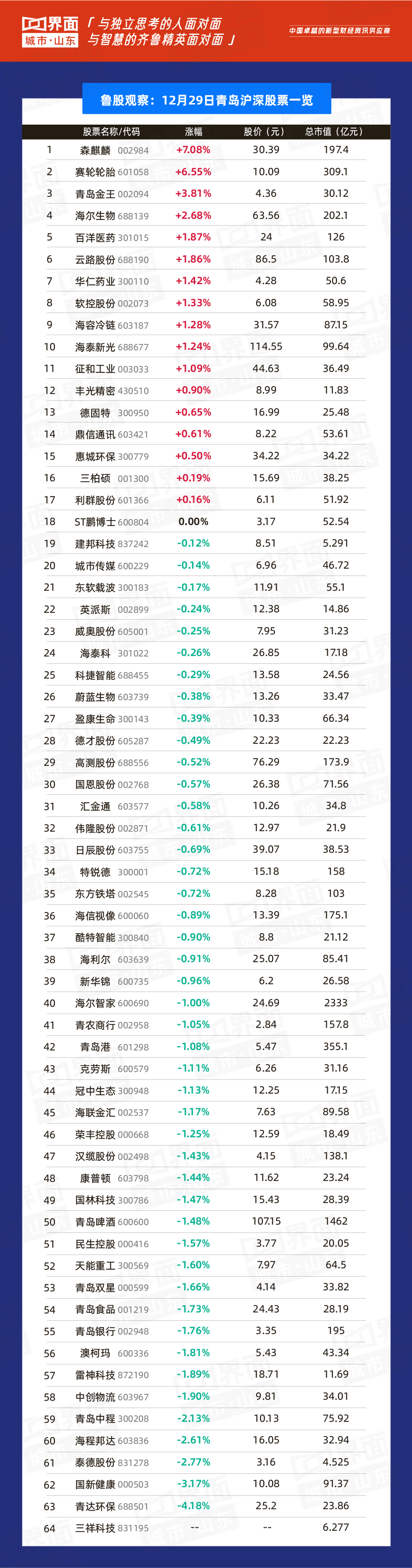 青岛市涨幅榜首:森麒麟(002984),涨幅7.08%,股价30.39元,总市值197.4亿元;