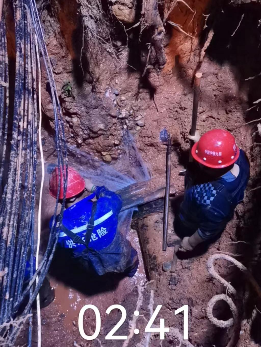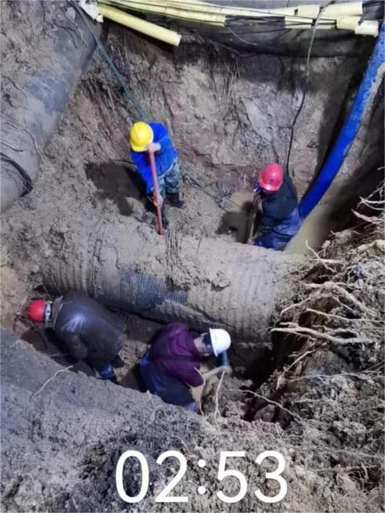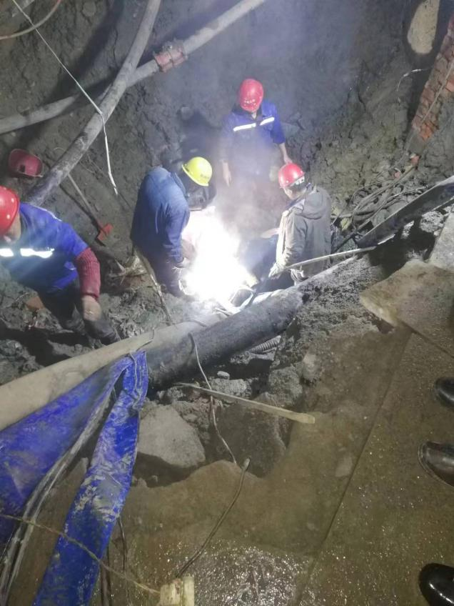 在水厂的统筹调度下,抢修队13名工作人员于11月9日23时开始抢修工作,在满是泥浆的挖掘点,队员们使用哈夫节对管道破损位置实施堵漏抢修。