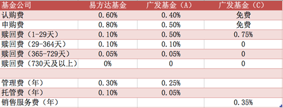 在费率方面,广发基金的产品认购费、申购费、管理费、托管费均比易方达基金更低,且设置了免申购费的C类份额,销售服务费为0.35%/年。