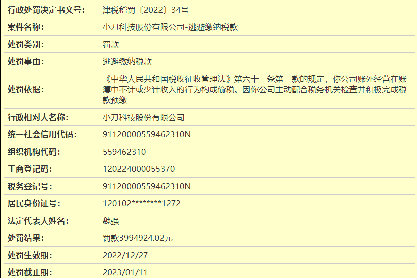 天眼查App显示,12月27日,小刀电动车关联公司小刀科技股份有限公司因逃避缴纳税款,被天津市税务局稽查局罚款约399.49万元。处罚依据显示,当事人公司账外经营在账簿中不计或少计收入的行为构成偷税。