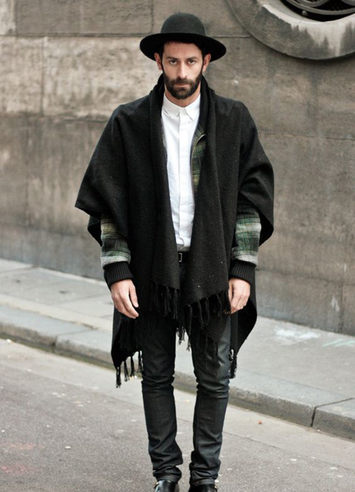 没有袖子的披肩斗篷线条感十分清晰,可以很好地修饰身形,壮一点的型男们也完全可以尝试。