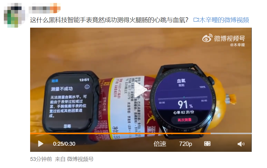 但离谱的事情来了,有网友把华为智能手表戴在了香肠上面,它居然也测出了血氧饱和度。