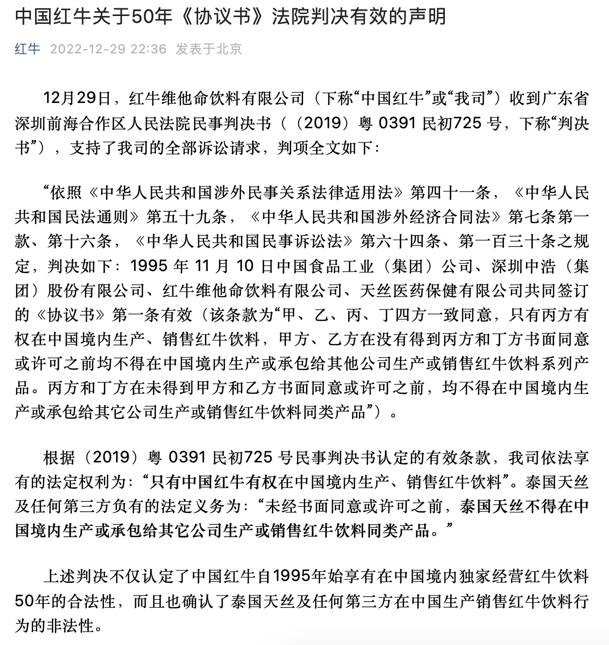 12月29日,红牛维他命饮料有限公司发布关于50年《协议书》法院判决有效的声明,公司收到广东省深圳前海合作区人民法院民事判决书,根据该判决,自2019年起泰国天丝陆续上市的红牛安奈吉饮料、红牛维生素风味饮料(进口、国产)、红牛维生素牛磺酸饮料以及红牛维生素能量饮料等,皆为非法生产或售卖的侵权产品。公司正告泰国天丝及代理商、经销商:即日起立即停止侵权行为,对继续生产、销售者,中国红牛将依法追究相关主体的法律责任。