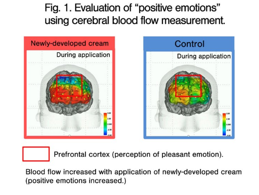 该研究做了两个颇具代表性的实验,第一个是研究护肤品对情绪影响的实验,通过脑血量测量发现,当增强护肤霜「丰富度、吸收度、湿润质地」这三种肤感时发现,受体的积极情绪会增加;