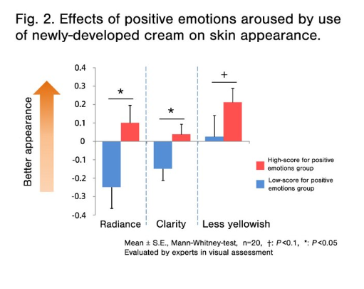 第二个则是研究情绪对皮肤外观的影响,参与者统一使用上述面霜,在家中涂抹面霜4周后,与相对低分数组相比,积极情绪高分数组的参与者在皮肤外观方面表现出更大的改善。