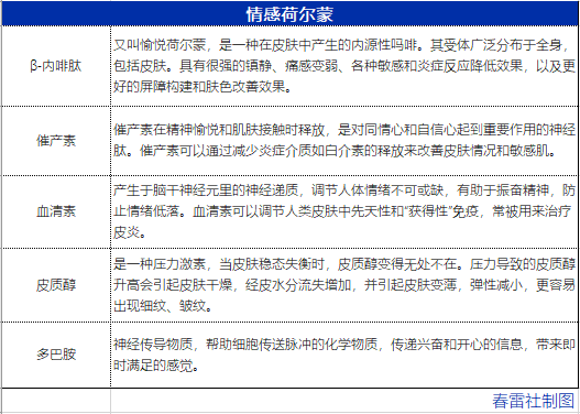 当代护肤品,多通过影响「情感荷尔蒙」分泌的方式来实现情绪护肤。而「β-内啡肽、多巴胺、催产素、血清素、皮质醇」这几种情感荷尔蒙,被认为是「最好的通路」。