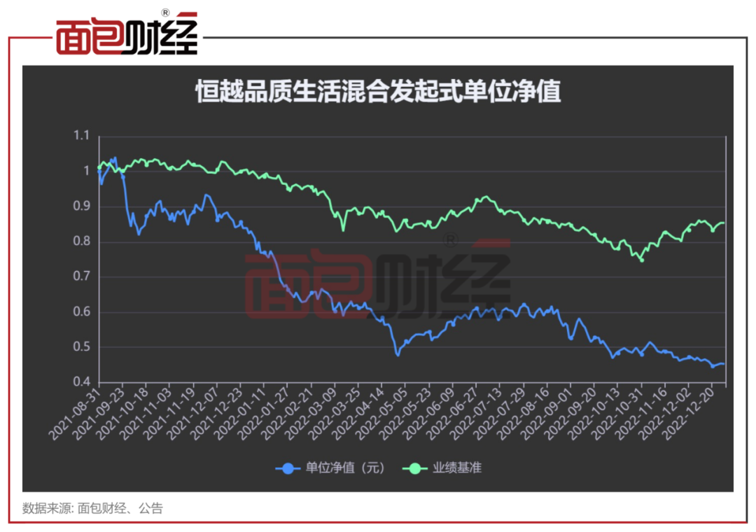 成立16个月以来,恒越品质生活混合发起式的单位净值表现较差,大部分时间跑输其业绩比较基准。截至2022年12月28日,该基金的单位净值跌至0.4532元,成立初期认购该产品的投资者若持有至今,则需承担超一半的净浮亏。同期,该基金累计跑输基准逾40个百分点。