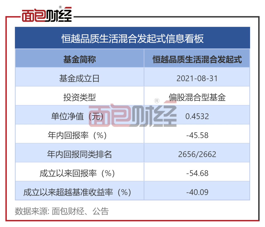 截至2022年12月28日,恒越品质生活混合发起式的单位净值跌至0.4532元,成立16个月目前仍大幅跑输业绩基准,并处于深度亏损状态。