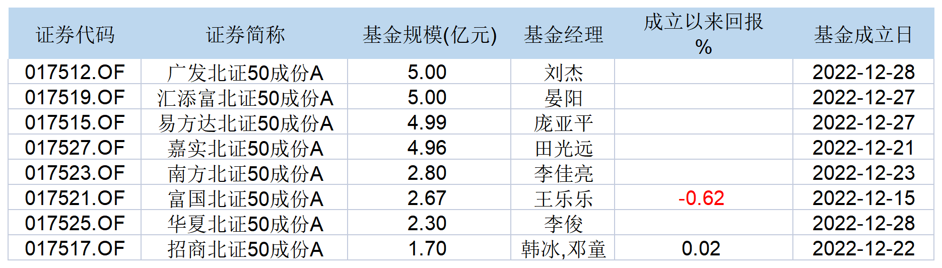 截至12月30日,最先成立的富国北证50指数基金的回报率为-0.62%,而12月22日成立的招商北证50指数基金的回报率为0.02%,这意味着这批北证50指数基金已经开始建仓。
