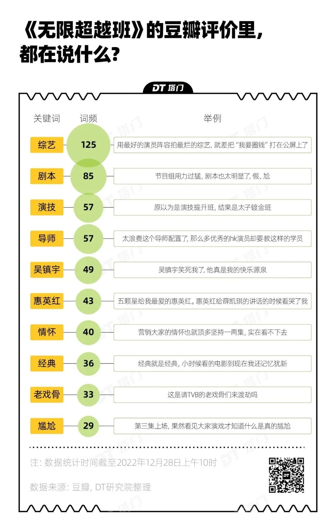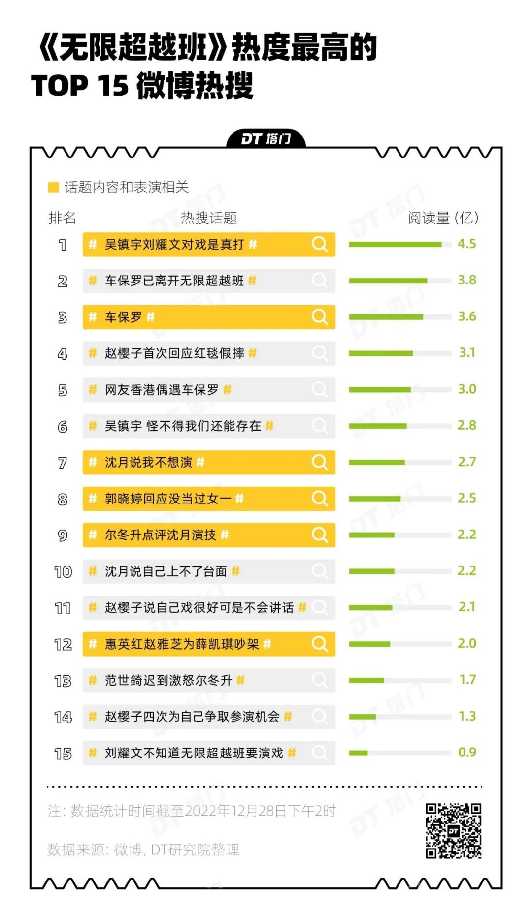截至2022年12月29日节目第三期开播前,这档节目热度最高的TOP 15热搜话题,只有6个和表演方式、技巧、态度等相关,更多集中在吐槽“内娱在高贵什么”。