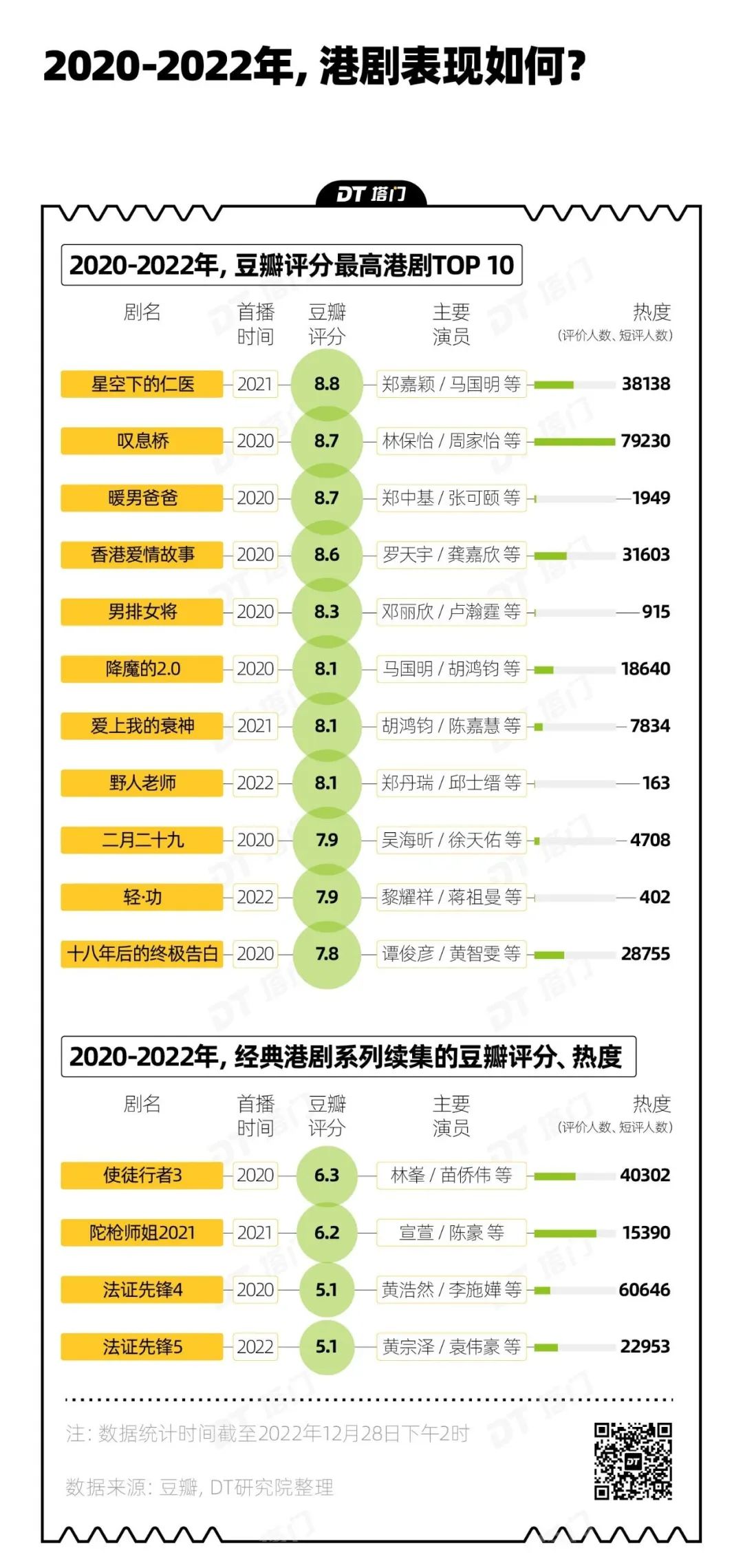 在2020-2022年这三年,豆瓣评分最高的港剧TOP 10中,只有4部质量与口碑并行,同时排进热度TOP 10。其余6部最低只有163人打分,唯一一部有超过1万人打分的还是系列剧,且新剧的主演基本上是观众不太熟悉的新人,颇有几分籍籍无名的落寞。