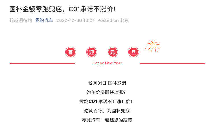 12月30日,零跑汽车官微发文称,零跑C01承诺不涨价。