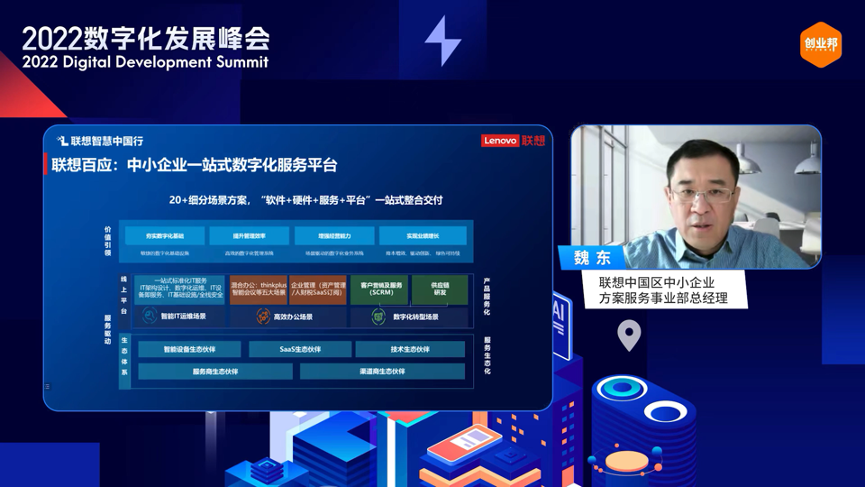 在名为《数字服务平台,助推中小企业踏上转型新征程》的主题演讲中,联想百应总经理魏东表示,在过去的三四十年中,联想经历了数字化和智能化转型的全过程,积累了更多的经验和方法。尤其是对于中小企业群体来说,数字化转型是走向成功的必经之路。为了更好的帮助中小企业完成数字化转型,联想在工信部举办的2022全国中小企业数字化转型大会上正式发布联想百应中小企业一站式数字化服务平台,在以“软件+硬件+服务+平台”的一站式整合交付,助力中小企业走出“不能转、不想转、不会转、不敢转”的数字化转型“困难区”。