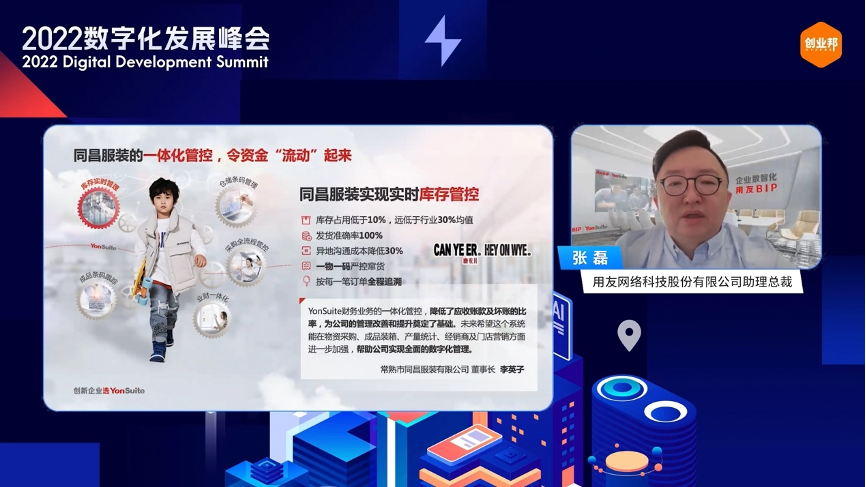 用友网络科技股份有限公司助理总裁张磊发表了《创新企业 高效增长的数智力量》的主题演讲,他通过案例展示,阐述了用友成长型企业商业创新平台YonSuite通过“现金为王、客户为本、效率为要、创新为魂”十六字经营方针,赋予消费品、服务业、医药流通等行业数智化力量,适应市场变化,提升管理能力,实现更高效增长。