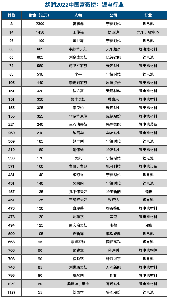 动力电池市场份额排名前十的企业中,来自比亚迪的王传福(1450亿元)、亿纬锂能的刘金成(605亿元)、欣旺达的王明旺(135亿元),以及国轩高科的李缜(95亿元)。