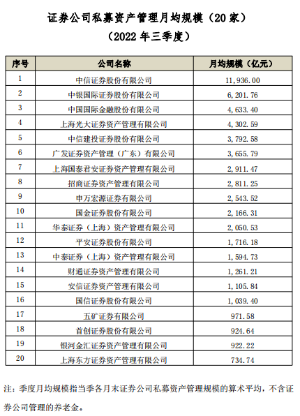 中国证券投资基金业协会最新披露的数据显示,截至2022年三季度末,中信证券私募资产管理月均规模为1.19万亿元,约为第二名中银证券的两倍。