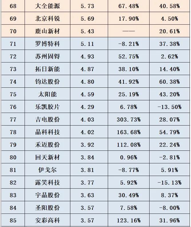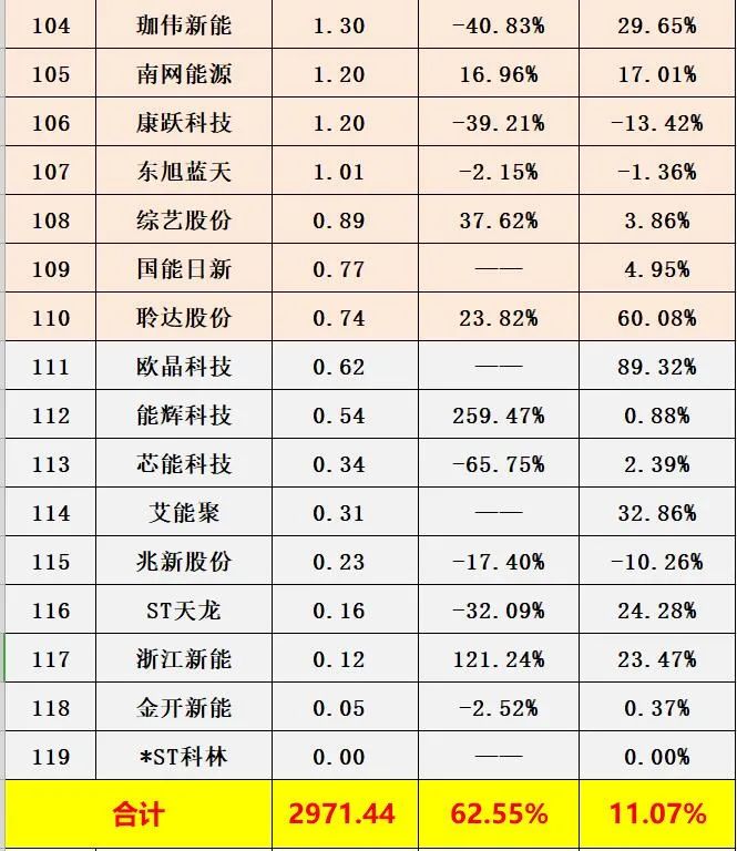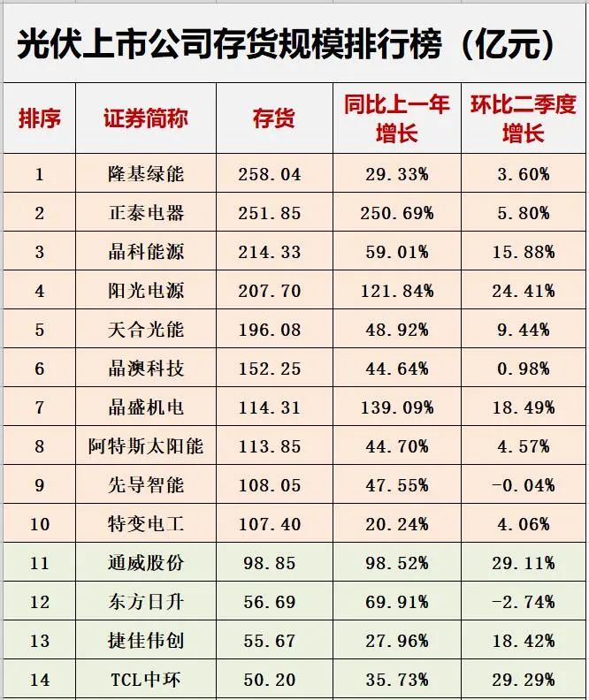 据黑鹰光伏统计,截止9月末,119家光伏上市公司存货规模合计近3000亿元,同比增长62.55%。具体到企业层面,51家光伏企业存货规模在10亿元以上,前十名企业存货规模均在100亿元以上,企业间存货规模及变化我们不再一一赘述,详见下表。(注:企业存货主要包括原材料、在产品、库存商品、发出商品等,各企业存货结构存在较大差异,本次降价对各企业影响还需进一步分析,本文数据仅是提供一个观察维度,不构成投资建议)