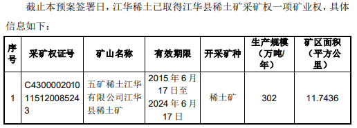 江华稀土的主营业务为稀土矿露天开采、分离、冶炼及其产品加工、销售等业务。公司目前主要产品为混合碳酸稀土、混合稀土氧化物。该矿区面积为11.74平方公里,生产规模为302万吨/年,采矿权有效期限至2024年6月。