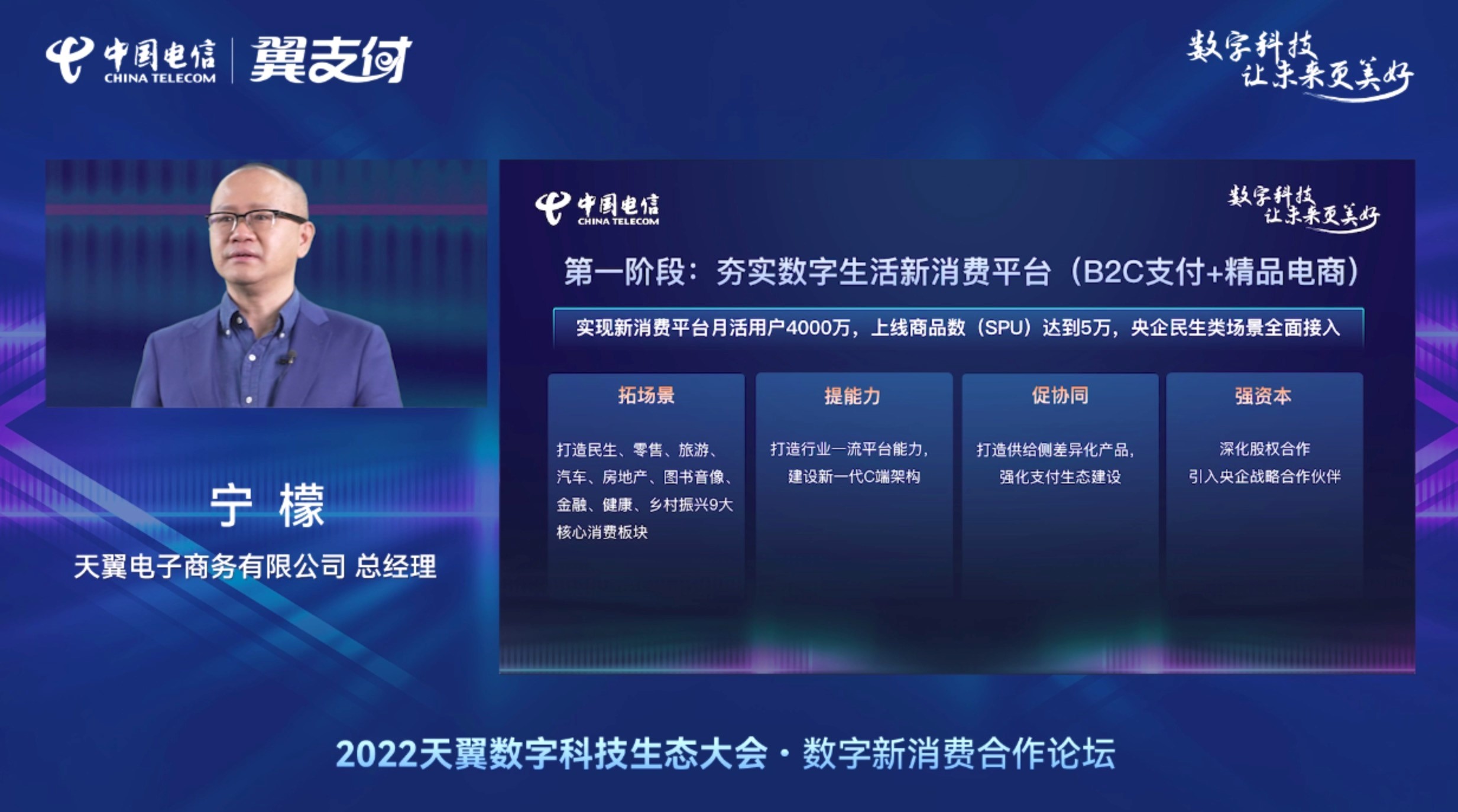 12月29日-30日,2022天翼数字科技生态大会以线上方式举办,本届大会以“数字科技让未来更美好”为主题,全面展示中国电信数字化科技成果。数字新消费合作论坛同步举办,论坛围绕数字消费业态进行深入的交流,探讨以数字化手段,依靠科技赋能、资源协同和生态融合等方式共同推动消费升级。