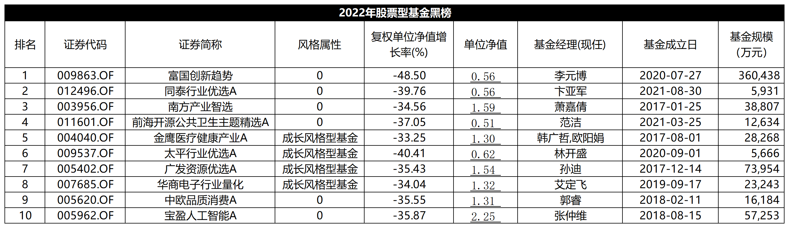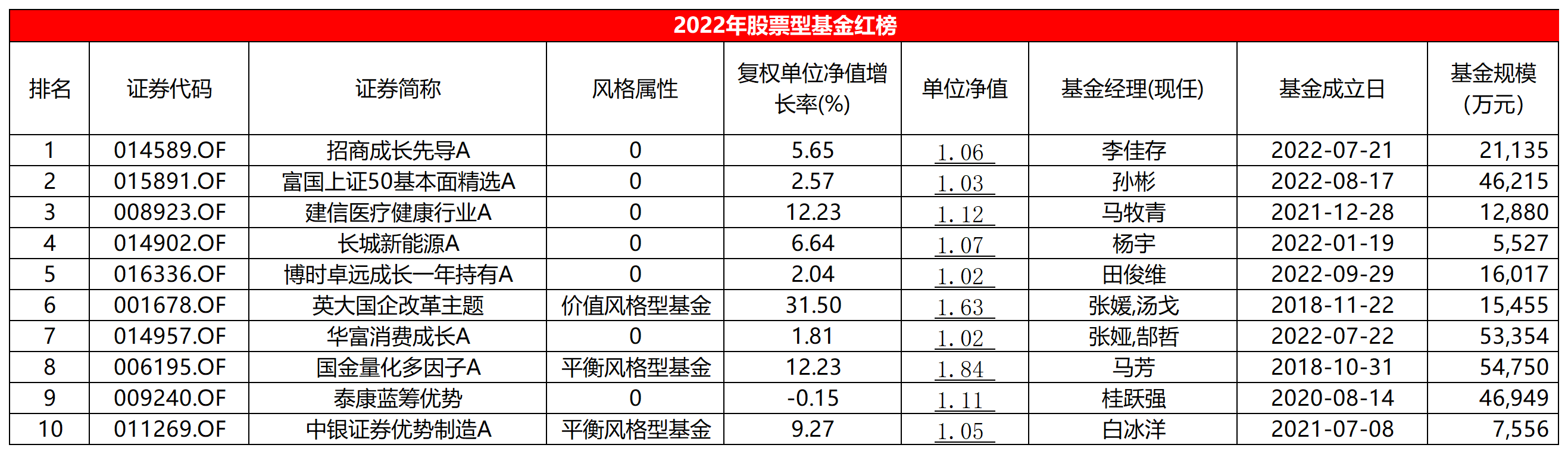 受基金合同中股票仓位的影响,主动股票型基金去年可谓是一片愁云惨淡。界面新闻综合收益率、波动率、择时与选股等维度对股票型基金进行了评估,同时对上榜基金进一步筛选,剔除资产规模合计低于五千万,以及成立时间不超过一个月的基金,并排除非投资收益原因造成的净值上涨,整理形成2022年度红黑榜。