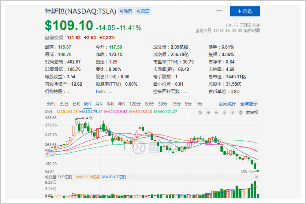 美东时间12月27日,特斯拉股价大跌11.41%,收盘报109.1美元,创两年来新低。截止发稿为止,特斯拉报收123.18美元,市值3889.72亿美元(约26830亿人民币),不到苹果市值的1/5。
