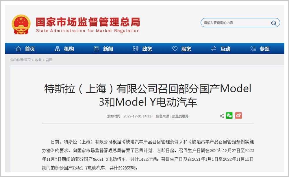 2022年12月1日,国家市场监督管理总局发布最新消息:特斯拉实施年内最大规模召回,涉及43.5万辆的Model 3、Model Y。