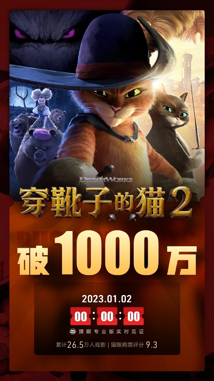 猫眼专业版数据显示,电影《穿靴子的猫2》上映11天,总票房突破1000万元。