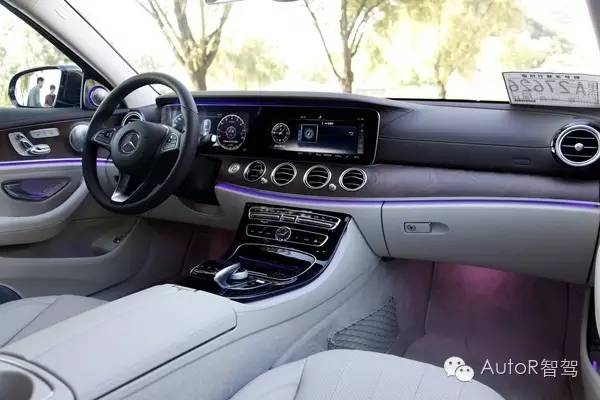 大面积的实木装饰面板采用了亚光漆面,视觉效果比较素雅,不会像光面木板那样散发出“土豪气质”。用手触摸起来,你可以感受到木头的纹理,而且由于每块木料的花纹都不相同,因此也就意味每辆车的实木装饰都是独一无二的。座舱氛围灯之前在奔驰S级上已经亮相过了,但S级上的氛围灯只有7个色彩,而全新奔驰E级却多达64个。氛围灯的色彩艳丽,却又不失柔和,与实木装饰交相辉映之下,有一种复古风格与现代科技相碰撞的韵味,让人顿时心生好感。至于那64个色彩究竟是否能被肉眼看出区别,其实倒也不必深究,这个配置的意义在于为车内增添一些细节上的情趣,目的达到了就足够了。