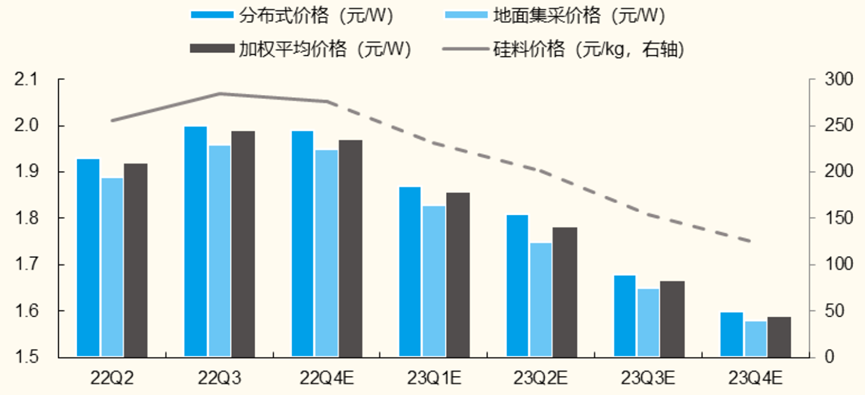 随价格回落后,国内及海外地面电站需求大规模启动,预计硅料价格下跌节奏在2023年的第二季度将会放缓,甚至出现阶段性反弹;