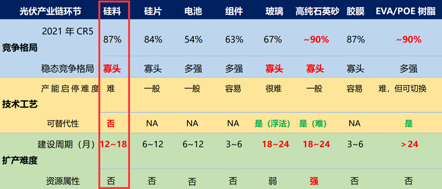 这主要是因为,硅料是技术、资金壁垒最高,产能最为刚性,而且扩产、爬坡周期最长的一个环节,同时叠加例行的检修、生产事故、限电等不确定性因素,远比硅片、电池、组件其他三个环节更容易出现供应不足的情况。