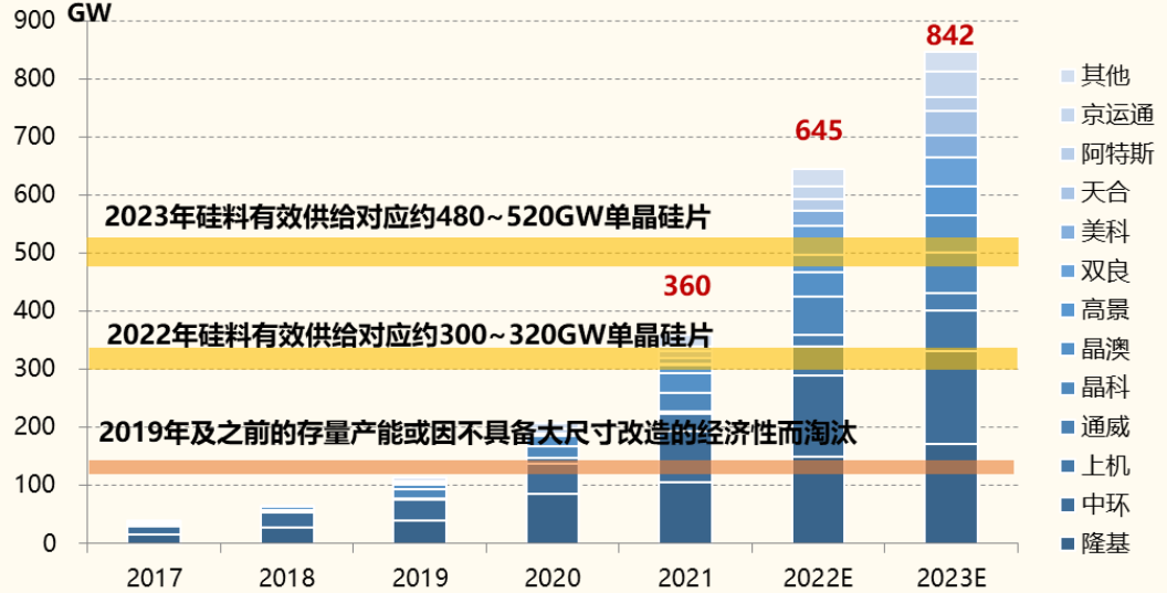 除了算硅料自身的账以外,对比硅片、电池、组件三大环节的扩产情况,也有参考价值。硅料相对于产能庞大的硅片来说,至少在2023年,还不用太担心。