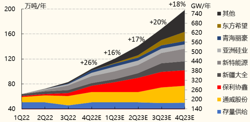 2023年,硅料主要供给增量包括协鑫包头10万吨、大全包头10万吨、通威乐山三期12万吨、新特准东10万吨、东方希望宁夏12.5 万吨、合盛硅业10 万吨等。