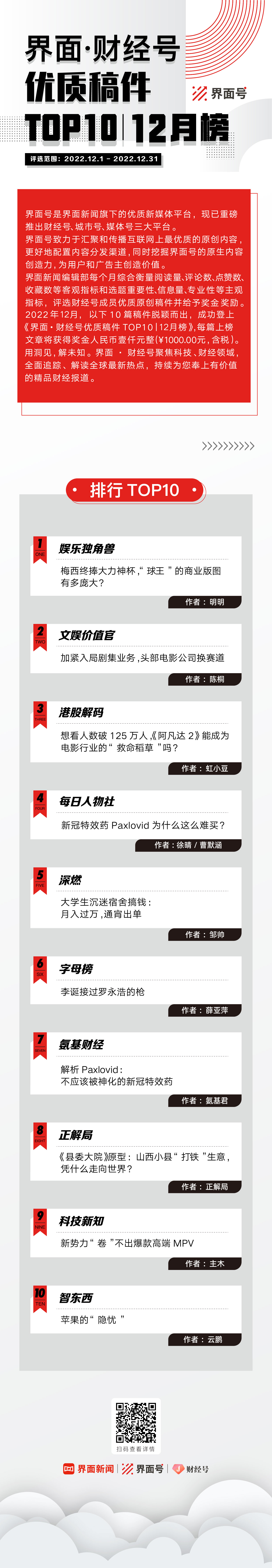 穿越四季,界面·财经号1000多位成员坚定立足于现实生活,持续观察千姿百态的商业现象,破解商业世界背后的秘密,在2022年12月1日至12月31日期间累计发文近2000篇。其中,以下十篇稿件脱颖而出,荣登《界面.财经号优质稿件TOP10|12月榜》(点击标题阅读原文)。