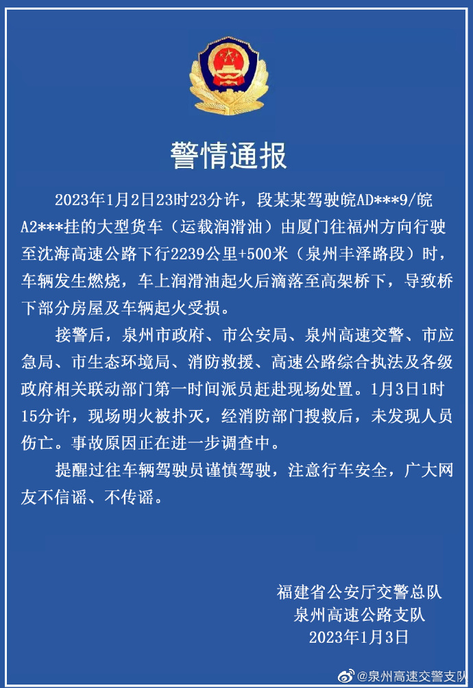 接警后,泉州市政府、市公安局、泉州高速交警、市应急局、市生态环境局、消防救援、高速公路综合执法及各级政府相关联动部门第一时间派员赶赴现场处置。1月3日1时15分许,现场明火被扑灭,经消防部门搜救后,未发现人员伤亡。事故原因正在进一步调查中。