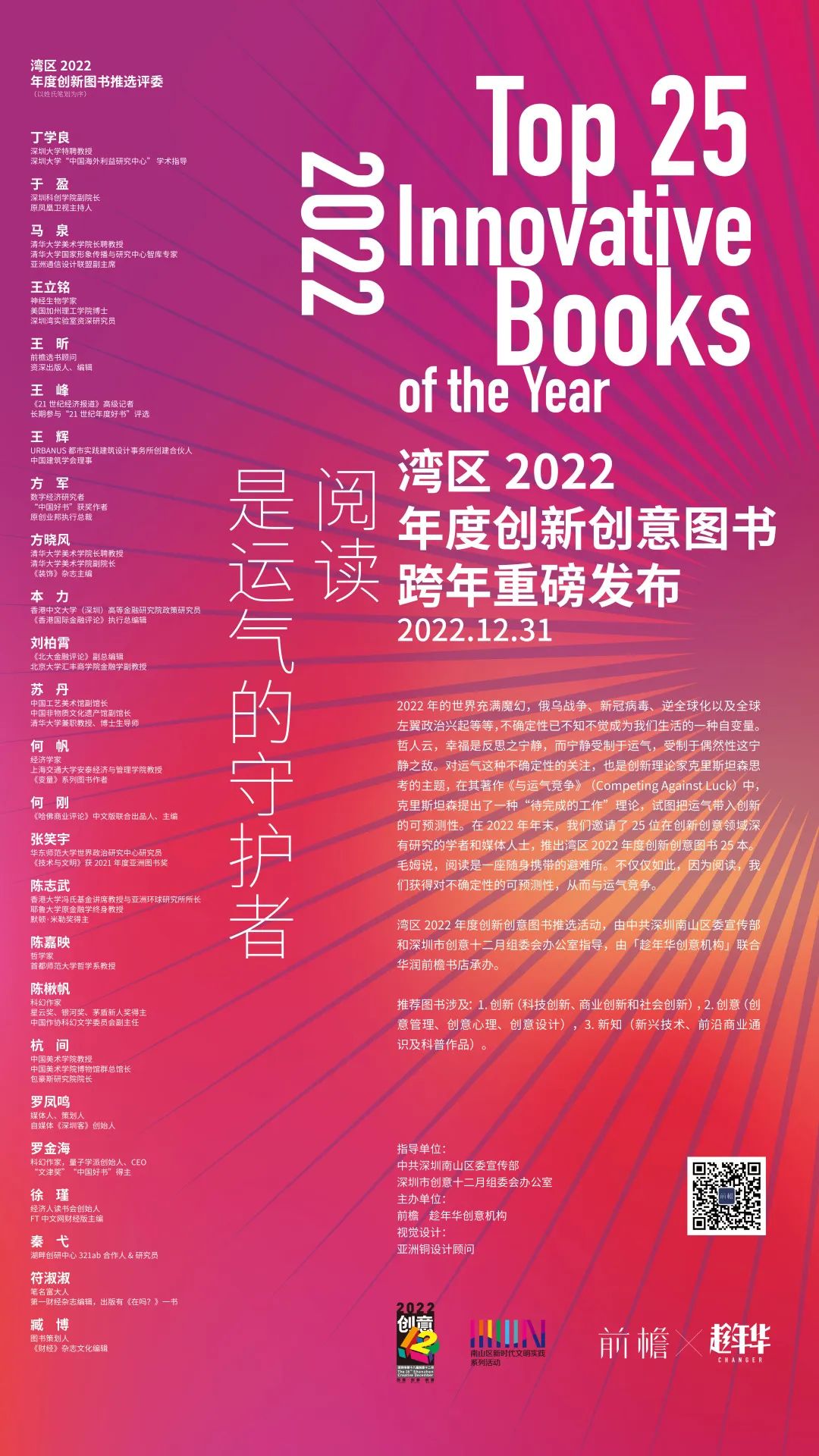 在2022年年末,我们邀请了25位在创新创意领域深有研究的学者和媒体人士,推出2022年度最值得推荐的创新创意图书25本。毛姆说,阅读是一座随身携带的避难所。不仅仅如此,因为阅读,我们获得对不确定性的可预测性,从而与运气竞争。