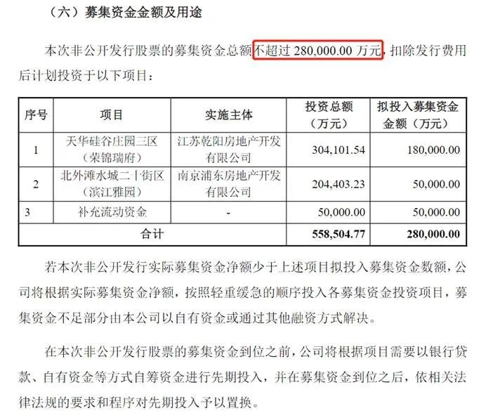 公告显示,苏宁环球此次定增募资的资金扣除发行费用后将用于天华硅谷庄园三区(荣锦瑞府),北外滩水城二十街区(滨江雅园),以及补充流动资金。