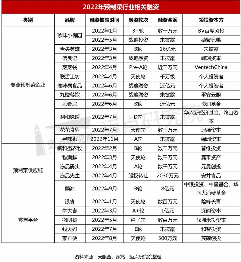 疫情之后,面向C端的预制菜被热捧,新品牌涌现,预制菜行业投融资不断。据不完全统计,2022年以来,中国预制菜行业融资事件20余起,融资金额达数百亿元。包括专业预制菜企业、预制菜供应链企业和零售平台等预制菜品牌纷纷获得融资。其中舌尖英雄、鼎味泰食品、乐肴居、蜀海、牛大吉更是宣布获得上亿资金投入,将2022年预制菜融资热度推向高潮。
