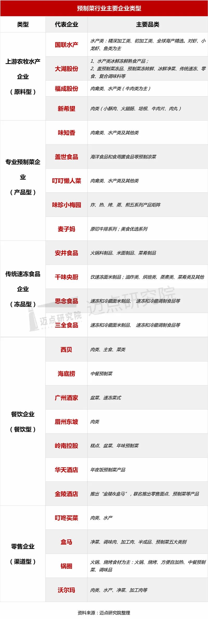 根据市场切入点不同,预制菜行业企业可以分为上游农牧水产企业(原料型)、专业预制菜企业(产品型)、传统速冻食品企业(冻品型)、零售企业(渠道型)、餐饮企业(餐饮型)几大类。