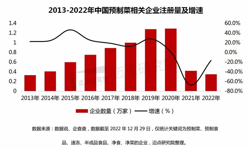 企查查数据显示,截至2022年12月29日,我国现存预制菜相关企业7.59万家。近10年来,我国预制菜相关企业注册量整体呈上升趋势,其中,2018年注册量超过1万家,2019年新增1.28万家,2020年新增1.29万家,2021年新增4212家,2022年新增3470家。不难看出,2020年预制菜相关企业增长势头最猛,2021年和2022年增速下滑。近年来,由于疫情的影响和冷链技术的逐步完善,预制菜行业在餐饮变革和居家消费的推动下迎来行业风口,行业入局者增多,竞争进一步加剧。