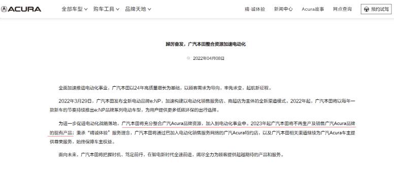 2022年4月8日,广汽讴歌在其官网发布的关于广汽本田整合资源加速电气化的新闻中表示,2023年起,广汽本田将不再生产和销售广汽讴歌品牌的现有产品。
