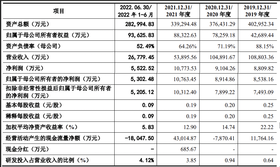 招股书显示,公司是智慧交通领域系统化解决方案提供商,主要业务包括智慧交通ETC产业链服务、智慧交通数字化系统服务等。2019年、2020年、2021年、2022年1-6月,公司实现营业收入分别为10.88亿元、10.49亿元、5.39亿元、2.68亿元,同期实现归属于母公司所有者的净利润分别为8538.16万元、8914.86万元、1.08亿元、5302.48万元。报告期内,智慧交通ETC产业链服务占主营业务收入的比重分别为98.79%、93.67%、78.88%、65.52%,是公司利润和收入的主要来源。