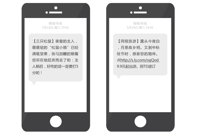 除了未经对方许可的短信发送,对接收者毫无意义的内容同样会被对方视为垃圾短信!真正意义的营销短信是通过短信通知服务与营销促动,来增强用户粘性,提高转化率,而不是一种盲目群发。短信的迅捷性、高曝光性,以及服务短信对品牌形象的提升,成为很多国际知名企业仍在使用短信营销的重要原因。