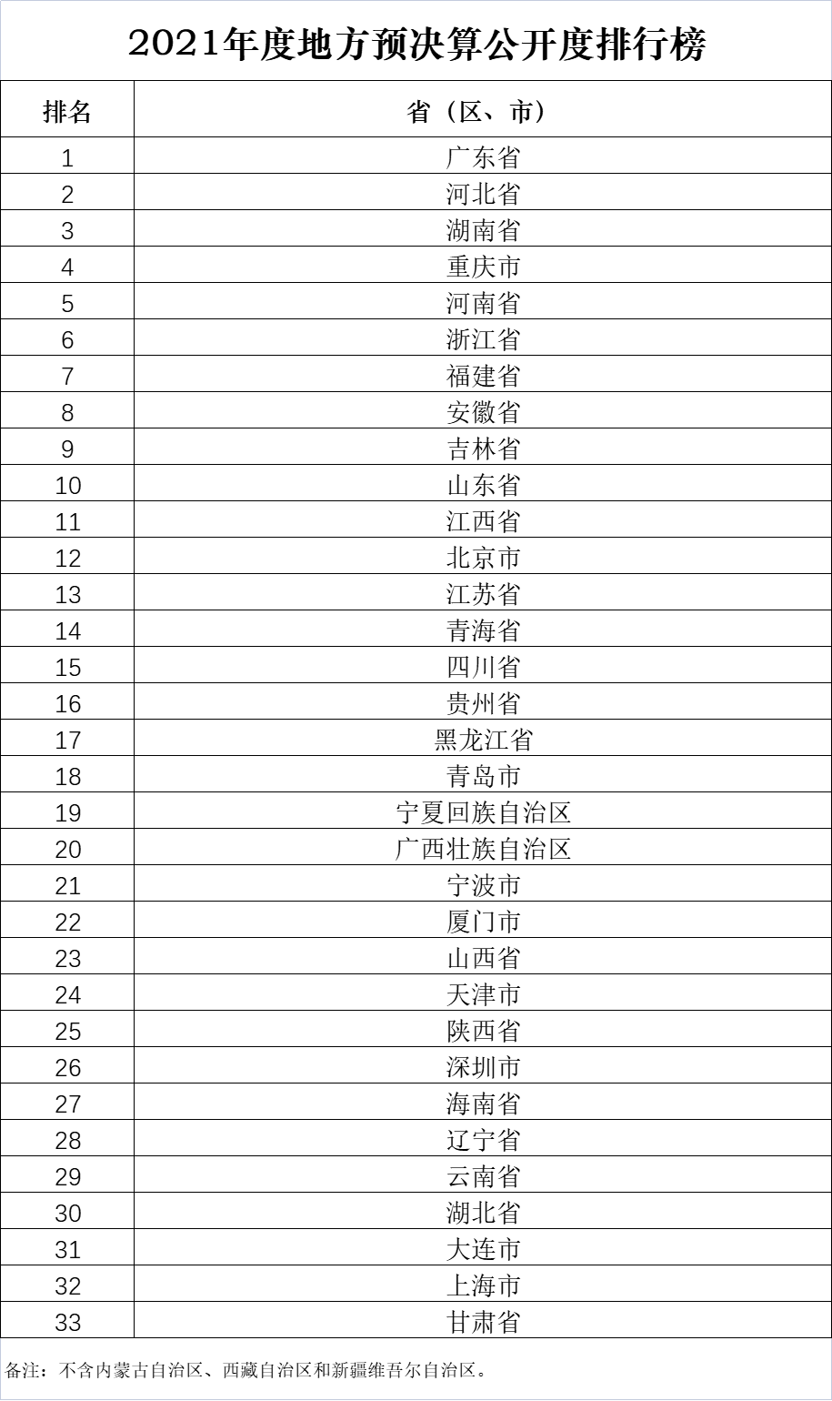 在组织开展专项检查的基础上,为科学、客观、全面评价各地预决算公开情况,财政部对各地进行综合打分,形成了2021年度地方预决算公开度排行榜,现向社会公开发布。下一步,财政部将认真学习贯彻党的二十大精神,深入贯彻落实习近平总书记重要指示精神和李克强总理指示要求,坚持守正创新,扎实推进预决算公开工作,加大政府预决算公开力度,扩大部门预决算公开范围,细化政府和部门预决算公开内容,不断提升公开的及时性、完整性、规范性,向人民群众晒出“明白账”,增强财政透明度,提高预算管理水平。